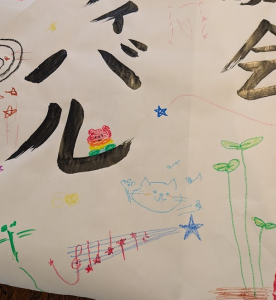 題字の周りには、たくさんの星や花や生き物たち。ヨッキー店長も2箇所、ひょっこり顔を出しています。