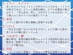 ChatAIさんが語るキーワード選出理由たち。 「つながり」については網の教会についての感想が多くの方から出てきたためにピックアップされたようです。教会の捉え方がユニークで魅力的と言ってもらえ、「対話」については、「この教会の姿勢そのもの」と断言してくれました。ありがとうございます。