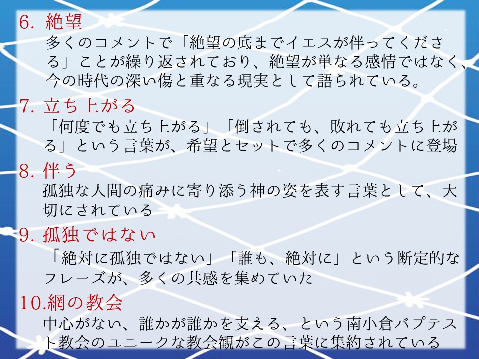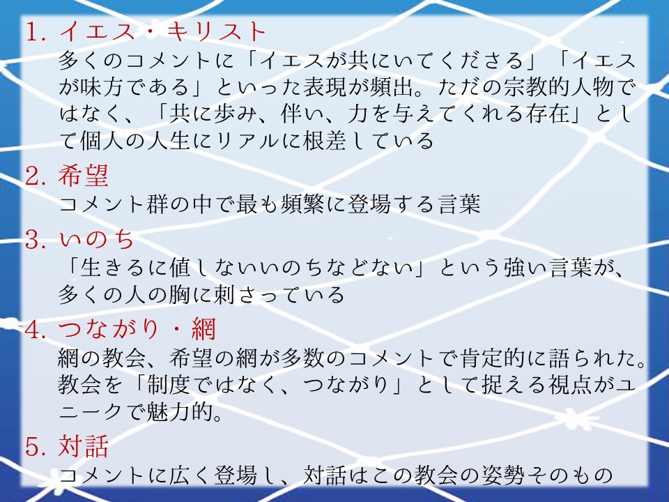 そして「網の教会」そのものもしっかりとキーワードとして出てきました。(多くの方のコメントに出てきていました。)