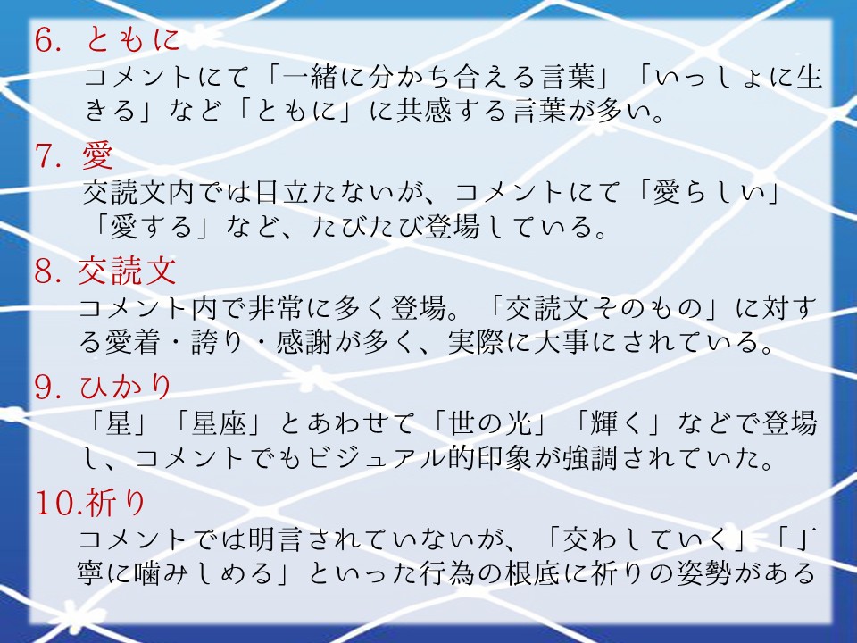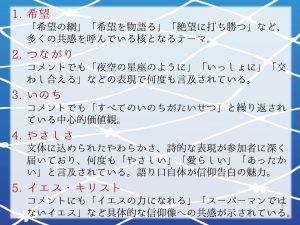 こちらも「いのち」や「希望」「つながり」そして「やさしさ」が出てきました。